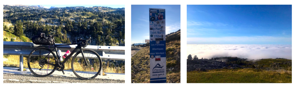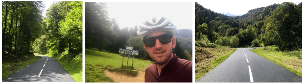 Sin duda, el puerto del día va a ser La Pierre de Saint Martin: 25km al 6%. Un puerto de más de 1.300 metros de desnivel y de los más largos junto al Col de Jau del primer día. Antes de llegar allí tenemos que pasar el Col de Ichere. Para ello, bajamos de Marie Blanque y con unos km. de nacional hacia abajo enlazamos con este puerto, corto, duro y bonito. Ya llevamos media subida y, por sorpresa, nos encontramos con dos miembros de la organización, David y Azahara, que nos animan y tiran alguna foto.
