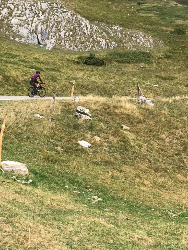 La suerte; subir uno de los puertos más bonitos de la ruta con muy buenas sensaciones. Acabamos de coronar. Nos tomamos una barrita, nos abrigamos y antes de bajar llegan Igor y Borja. Bajando en dirección al Col de Agnes oigo como algo cae de mi bicicleta, pero de un rápido vistazo no veo que me falte nada. Dos días más tarde descubriré qué es.