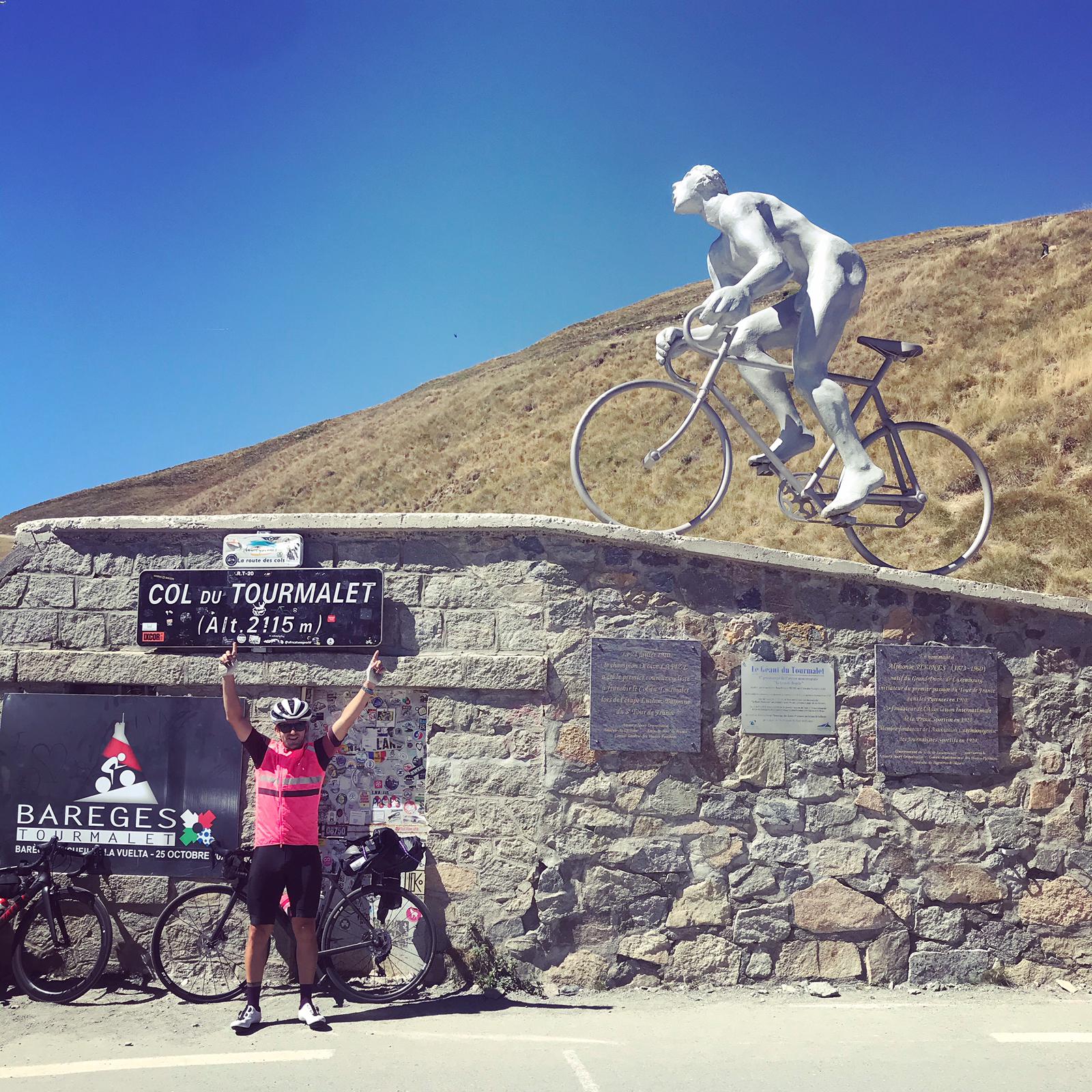 Chema sigue. No se rinde. Iniciamos el ascenso al puerto de los puertos, el Tourmalet. Es mediodía y estamos a algo más de treinta grados. Soy de Murcia, ¿dónde está el problema? El Tourmalet no tiene grandes curvas de herradura ni descansos, solo es subir y subir. Vamos bien, buen ritmo, sin parar, sin relajarnos, pero sin pasarnos de fuerza. A falta de 5km es cuando disfrutamos de las mejores vistas de esta parte del valle. Además, no paramos de ver coches, motos y otros ciclistas subiendo. Veníamos de subir puertos totalmente solos, con vacas a los lados de la carretera o con otros corredores de la carrera y la verdad que, ver tanta gente, motiva mucho. Se está haciendo largo pero es un puerto que conozco también de las carreras y la historia que tiene que lo estoy gozando. Ya casi lo tenemos. Faltan 500 metros para coronar y me aparece ese escalofrío que te dice: chaval, atento que esto es importante. Deja de pensar en molestias y problemas, que estás subiendo el Tourmalet. ¡¡El p*to Tourmalet!! Ya llegará el invierno y el Collado Bermejo para tener la cabeza en otra cosa. ¡¡Estoy muy feliz!!