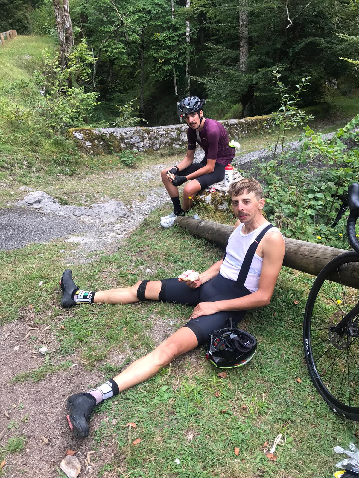 Empezamos a subir tranquilos, intentando llevar un ritmo controlado pero sin dejar que nos coma el tiempo. Justo antes de mitad de puerto paramos, necesitan darle un descanso a la pierna. Los puertos tan largos son complicados de gestionar cuando llevas molestias, sobrecargas o dolor como es este caso. En mi opinión, se está haciendo lo que mejor se puede, intentamos ir activos mientras pedaleamos y descansar parando y aprovechar para comer, porque ir muy lento sirve cuando vas bien y cómodo, pero no cuando vas jodido.