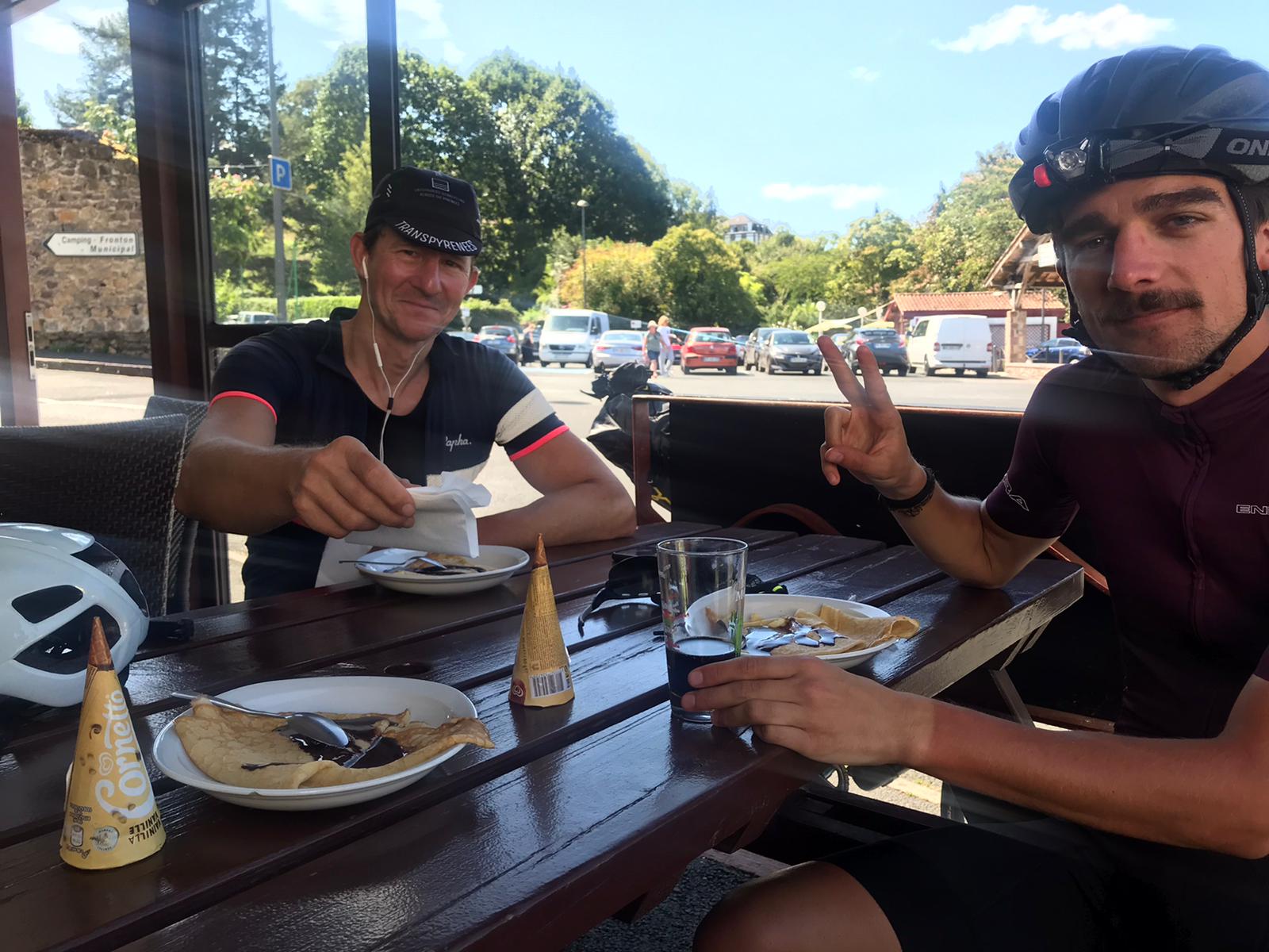 Nos habíamos puesto como objetivo llegar entre las 14:00 y las 15:00 a Saint Jean Pied de Port (donde muchos peregrinos inician el Camino De Santiago) lo hacemos justo a las 14:30. Esto pinta muy bien. Momento perfecto para parar a comer los bocadillos que llevábamos como provisión de la etapa anterior. En ese momento aparece Mike, con el que compartimos coca-cola, helado y crepe de chocolate. (no realfooding days).