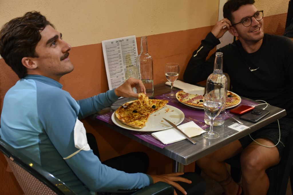 Ya arriba, con frío y cansancio, bajamos con idea de buscar algún sitio para dormir en la calle por Genès. Estamos sobre los 10ª-15ª. Y aquí se obra el milagro. En una pizzería de la bajada está Borja, Bruno y Enekoitz cenando. Ellos van a seguir un poco más, nosotros hoy no podemos más. No quiero que me pase lo mismo de la noche anterior y Chema lo ha pasado muy mal subiendo este último puerto. Obligatorio parar.