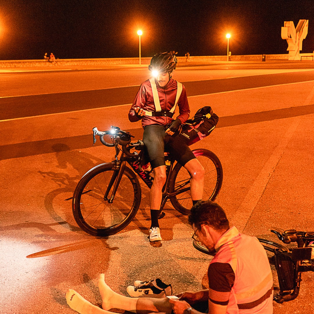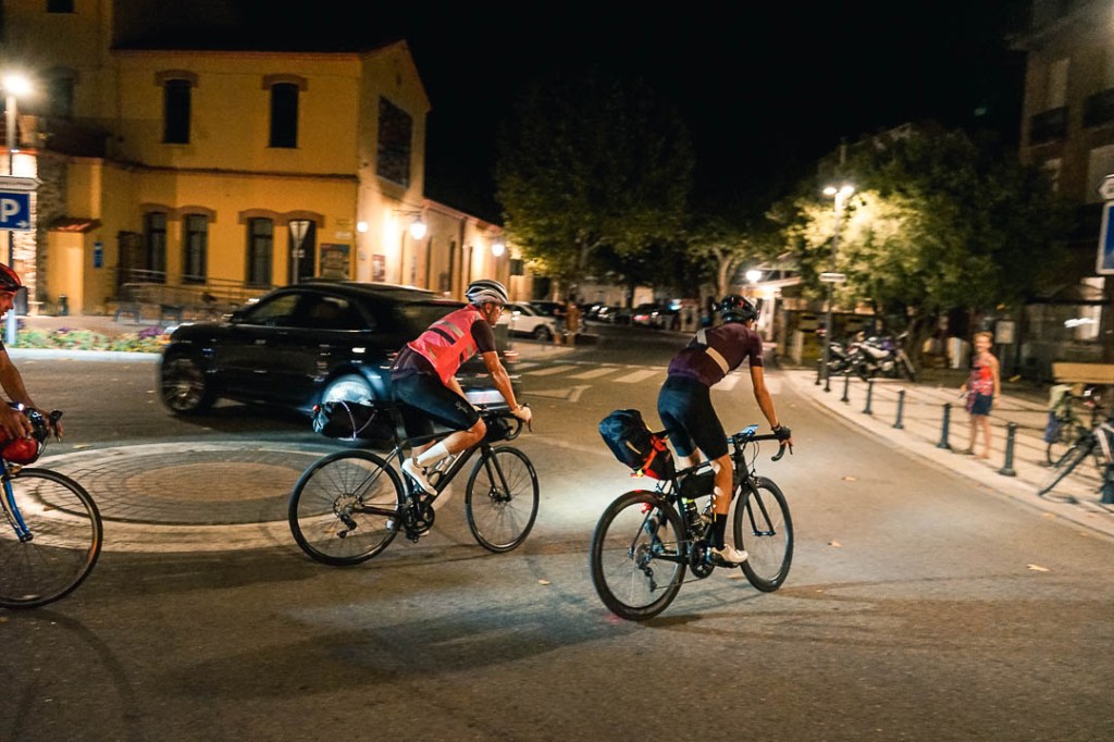 Los primeros puertos son cortos y sin grandes pendientes. Los pasamos rápido e intentamos recargar agua en casi todos los puntos que teníamos programados (¡gracias al gran trabajo de Chema!). Antes del amanecer ya habíamos subido y bajado los puertos de Frare, Belitres, Llagastera, Llauro y Fourfou. Aunque voy relativamente bien, las sensaciones no son las mejores en estos momentos. Quizás tantos cambios de temperatura o las paradas a quitar y poner ropa hacen que me cueste encontrar mi ritmo. También, cambié el desarrollo de los piñones la semana anterior, para intentar ir más cómodo en los puertos duros, pero para zonas medias y bajas no termino de encontrar el desarrollo correcto, o iba atrancado o me faltaban piñones.